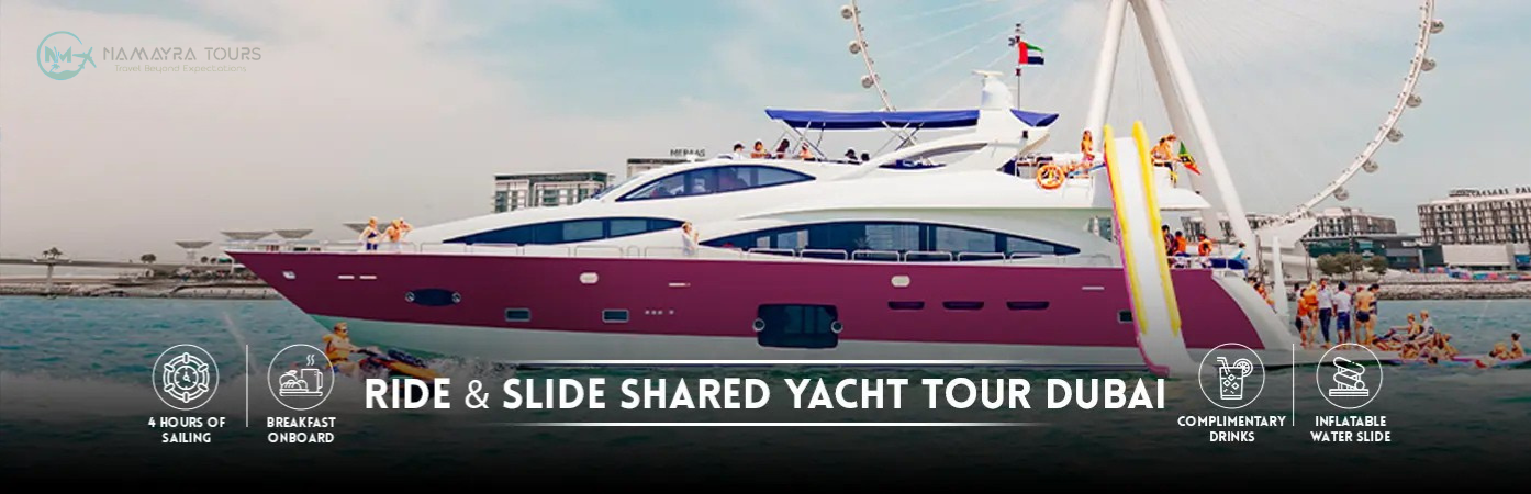 Make your Dubai trip extraordinary with this ride and slide shared yacht tour Dubai, a perfect mix of water adventure, scenic cruising, and luxury dining on the Arabian Gulf.